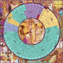 Year of Grace Calendar 2018 is an illustrated circle-of-the-year Catholic liturgical calendar on paper poster; 26" x 26"