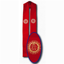 Beau Veste Sunburst I H S Priest Overlay 10-777, is a Priest Stole with the I.H.S symbol that is in the center of a sunburst which is embroidered in gold on each side of the overlay. This style available in 8 different colors