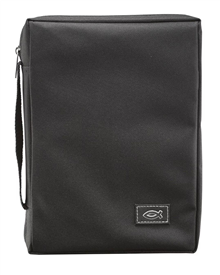 Black poly-canvas Bible cover with a fish emblem stitched into the lower right corner of the front and has a zipper pocket on the back