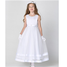 A full-length First Communion dress that has a satin bodice with a glitter tulle skirt and pearl neckline (accessories not included)