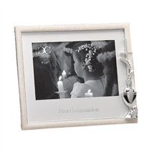 A beautifully designed First Holy Communion frame featuring a cross, wheat, and chalice motif, perfect for displaying a cherished 4 x 6 Communion photo.
