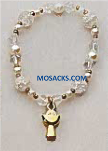 First Communion Gold Clear Chalice Bracelet by Roman Inc. is a stretchy bracelet with imitation pearl, glass and silver plated metal. First Communion Gold Clear Chalice Bracelet-26281F QUANTITY PRICES