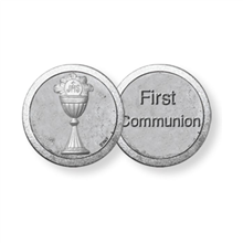 This beautiful First Communion pocket coin is about the size of a 50 cent piece. It is made of handsomely engraved silver oxidized metal.
