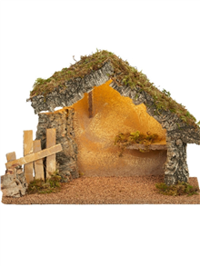 The 5" Scale LED Lighted Nativity Stable is made with wood, moss, and bark, creating a rustic setting for a nativity display.