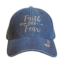 Face the future with courage and conviction with the grace & truth® Faith Over Fear Hat in Denim Blue. As followers of Jesus, we are held safely in the palm of His mighty hand.