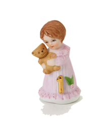 An adorable brunette baby girl stands in a powder pink dress holding a teddy bear. On the bottom of her dress, a raised golden number "1" and flower detail show the girl's age.