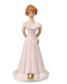 An adorable brunette girl stands wearing a powder pink dress with flower detail. A raised golden number "13" rests at the bottom of the dress to show the girl's age.