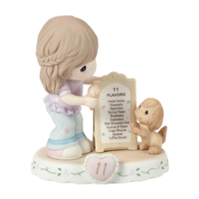 Precious Moments porcelain statue of brunette girl holding an ice cream cone and looking at a list of flavors with her dog, the number 11 is in the center of a pink heart 5.25"