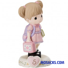 Precious Moments Growing in Grace Age 5 Brunette 5 inch 152011B. Precious Moments porcelain statue of a brunette girl with pigtails and pink bows walking with a pale pink lunch box and books, the number 5 is in the of a pink heart 152011B