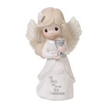 A 4.75-inch hand-painted Precious Moments angel with chalice and glitter accents, celebrating a child’s First Communion.