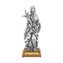 A finely handcrafted pewter St. Lucy statue with exquisite detail, a gold-tone base, and elegant gift packaging, proudly made in the USA.