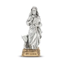 A finely handcrafted pewter St. Luke statue with exquisite detail, a gold-tone base, and elegant gift packaging, proudly made in the USA.