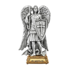 A finely handcrafted pewter St. Michael the Archangel statue with striking detail, a gold-tone base, and elegant gift packaging, proudly made in the USA.