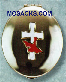 Polished Brass Pyx Cross Dove is 2-7/8" in diameter, 1/2" deep. Brass Pyx has a Cross Dove Design and 25 Host Capacity-87028