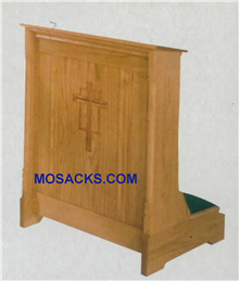 Prie Dieu Kneeler with shelf 24 "w x 21" d, 32" h 40-265 is a wooden Prie Dieu with cushioned Kneeler, and a shelf with a carved cross in the front panel Top is slanted for arm and hand comfort. 40-265 FREE SHIPPING