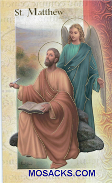 Laminated Bi-fold Prayer Card of St. Matthew, one of the Mini Lives of The Saints, biography holy card in Gold Stamped Italian Art and made in Italy, F5-500