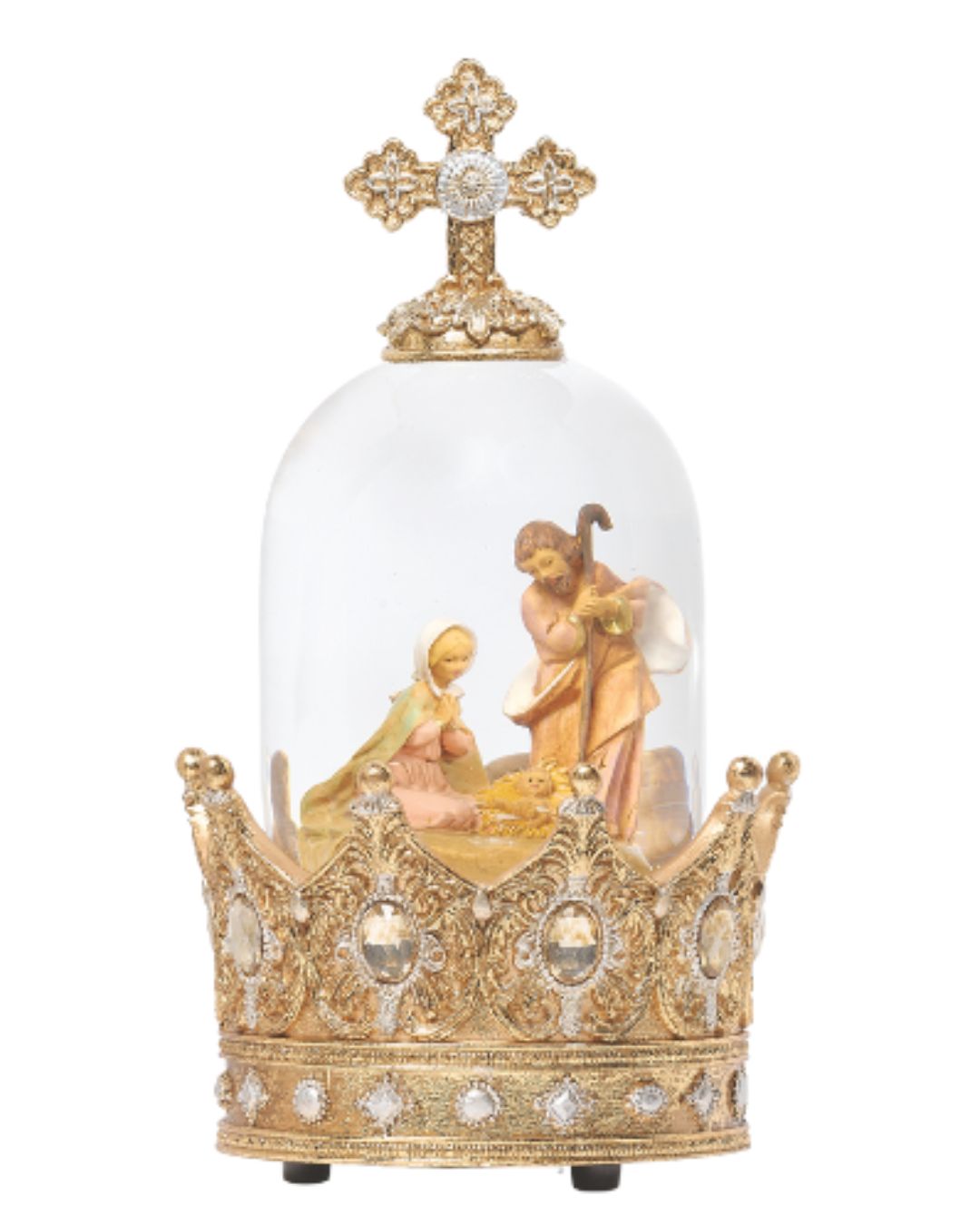 This exquisite display features the Holy Family nestled beneath a glass dome, encircled by a regal crown base embellished with gemstone-like accents. Delicate and reverent, the scene within captures Mary and Joseph in soft tones gathered around the Infant Jesus. A wind-up mechanism gently plays "Joy to the World," making it a cherished piece for seasonal decor or gifting.